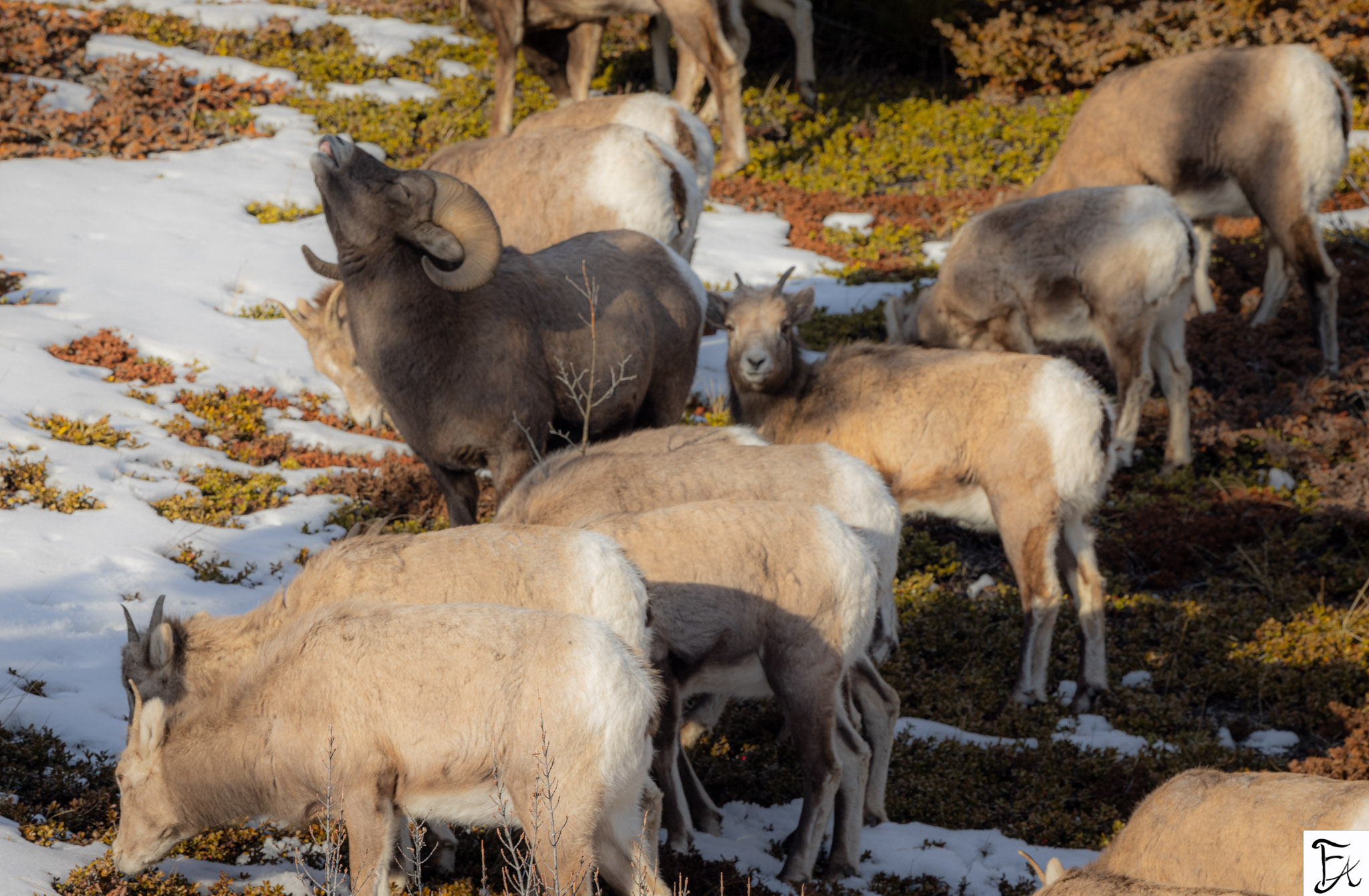 On a brisk winter day in western Alberta, a herd of bighorn sheep grazes across the rocky slope—earthbound, focused, enduring. Yet one lifts its gaze skyward, as if offering silent thanks to the sun, the season, and the sustenance beneath its hooves.