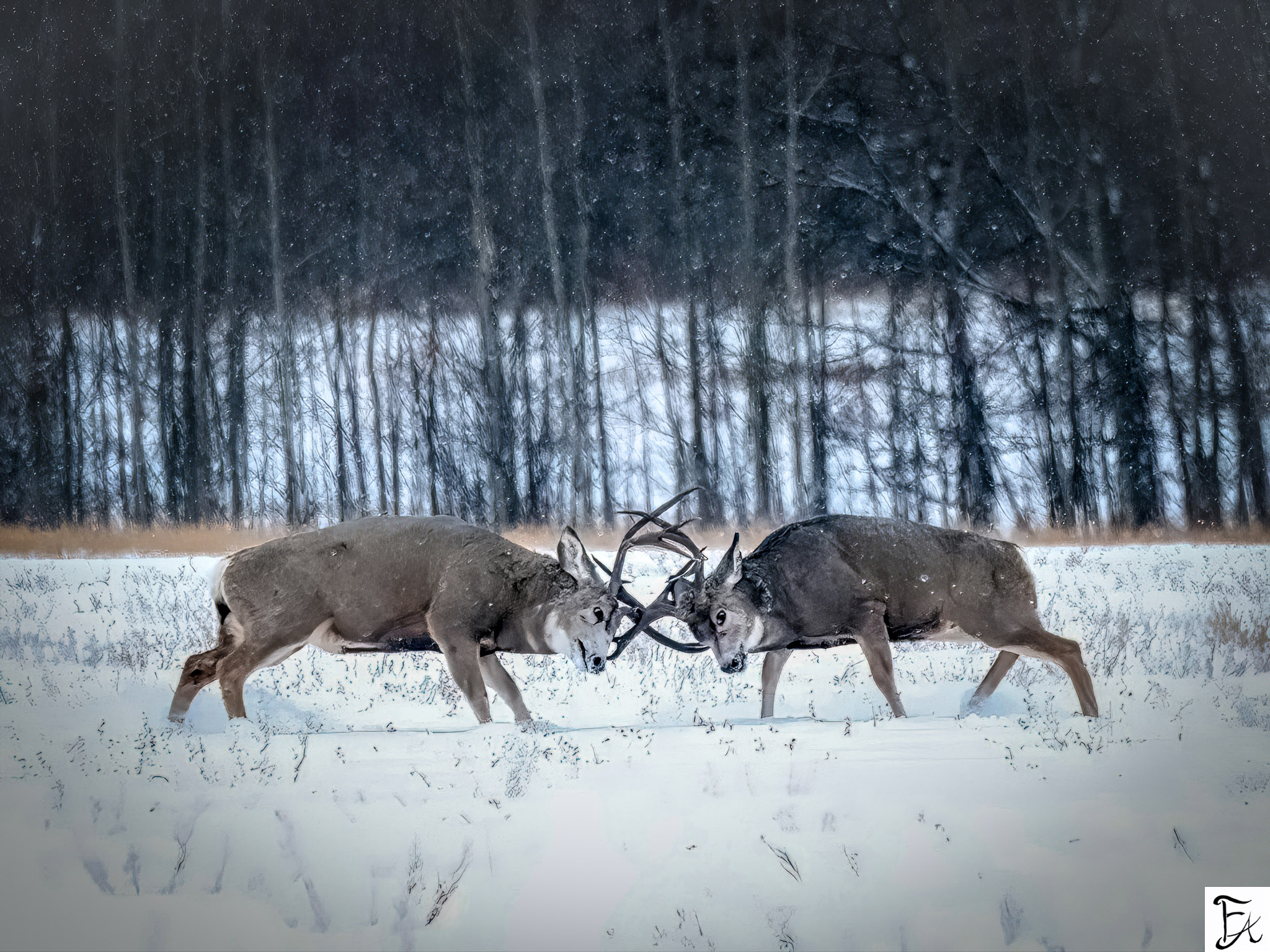 Two mule deer bucks clash in the snow—antlers locked, eyes burning with primal intent. This image captures a moment of raw, unrelenting force: the pinnacle of masculinity as shaped by nature’s hand. It is not brutality for its own sake, but ritual—an ancient rhythm of dominance, survival, and legacy.