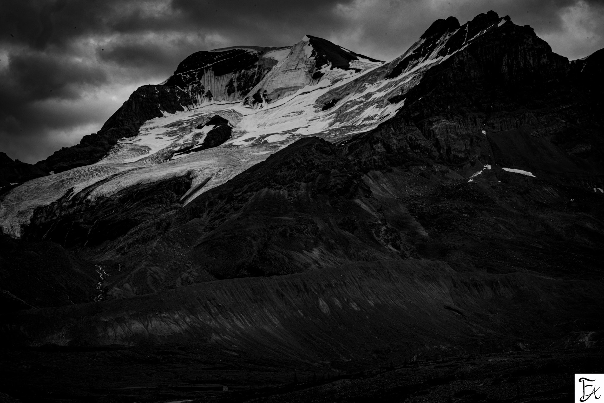 In the heart of the Columbia Icefields, I stood before what once was vast—ice that stretched beyond sight, now receding into memory. Captured in monochrome, this image bears no warmth, no comfort. The glacier is still white, but its abundance feels hollow. Bleak. Weathered.